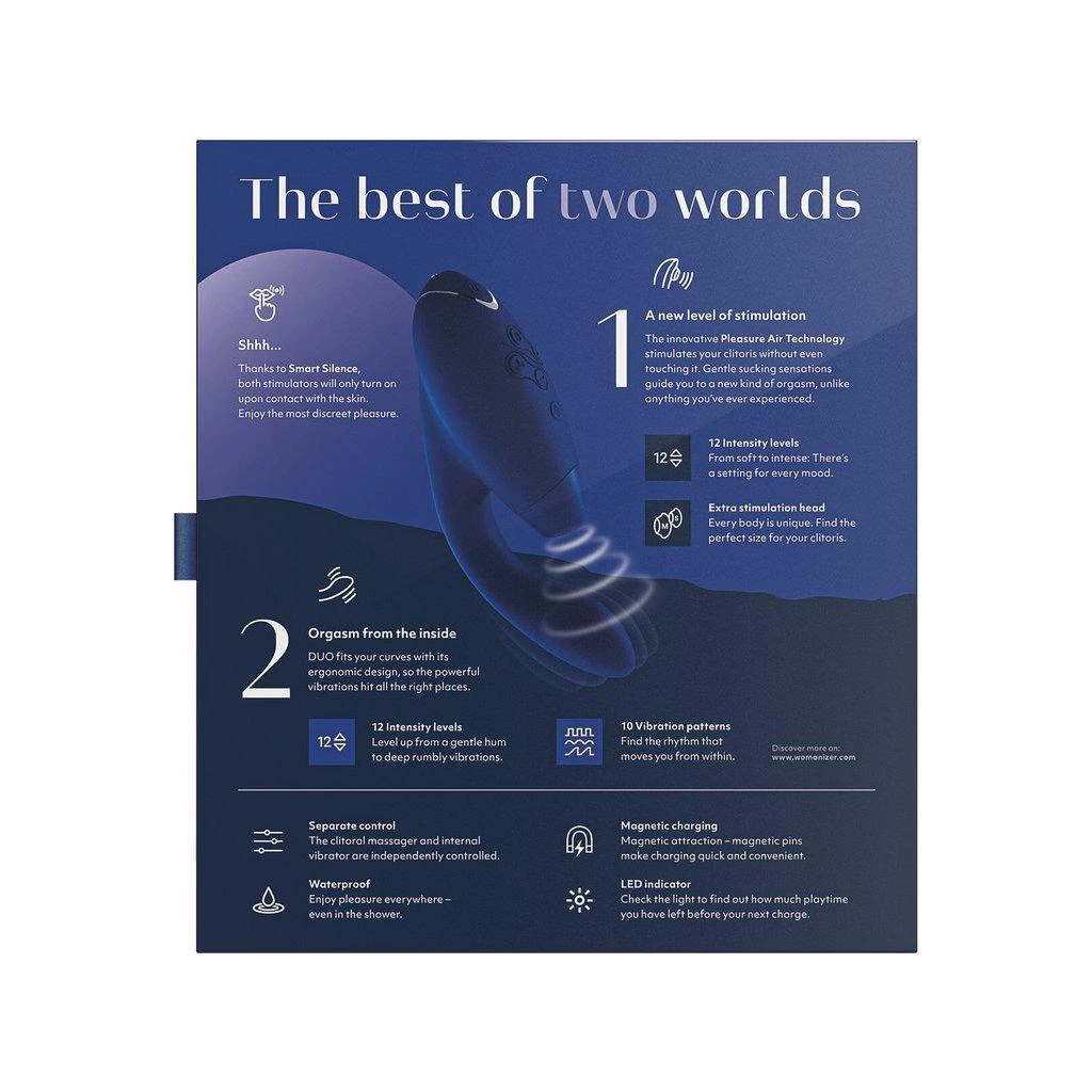 - Waterproof Use: The Womanizer Duo Clitoral and G-Spot Stimulator is waterproof and submersible, and you can use it underwater in the shower, bathtub, or hot tub, or have a private pool party with it.