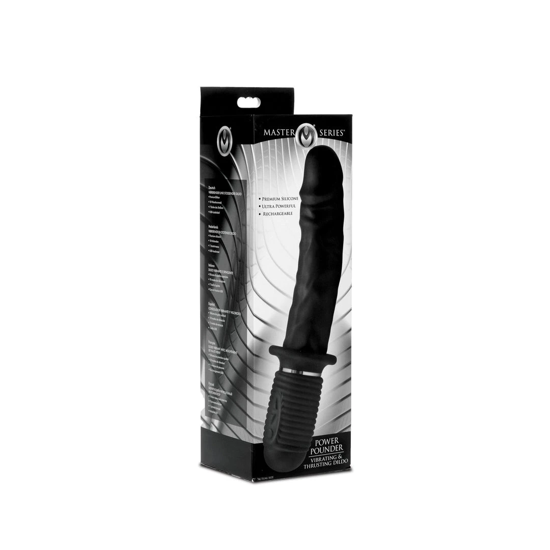 The Master Series Power Pounder Vibrating & Thrusting Dildo comes from XR Brands and is made with patented technology and provides dual sensations. The working end – the dildo has a veiny ribbed texture and a realistic head, while the handle is ribbed to accommodate the thrusting mechanism and has the control buttons.