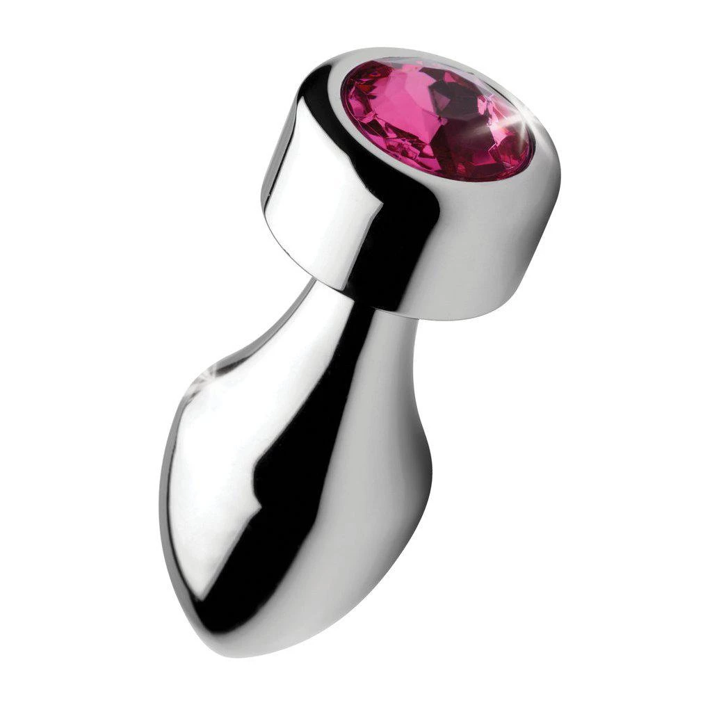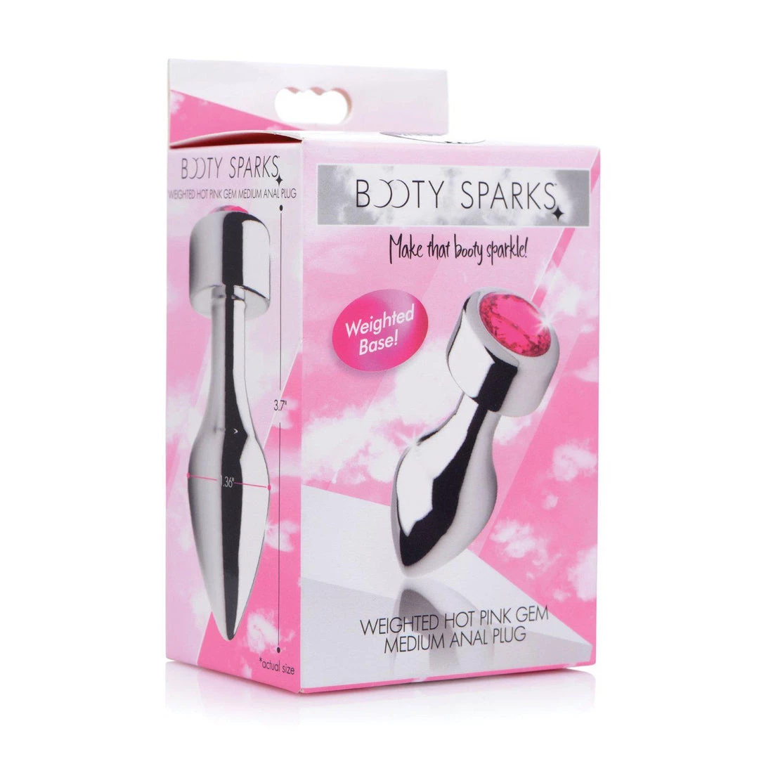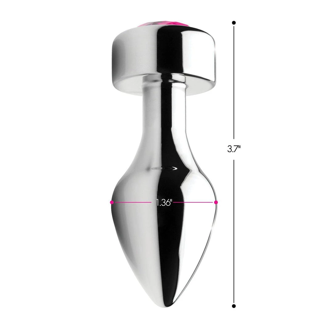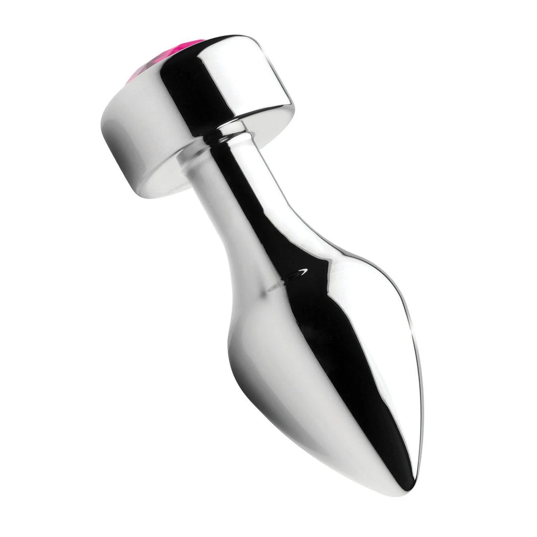 Adorn your derriere with this dazzling pink gem! The weighted base adds a comfortable and satisfying weight to your anal play, opening a new world of sensation for enthusiasts. Available in three different sizes, this gorgeous butt plug features a pink, sparkling gemstone embedded in a round-shaped base. Your plug features a tapered tip for easy insertion and a tight neck for gentle pressure and extended wear. It also comes with a vibrating ring to take your pleasure to the next level!