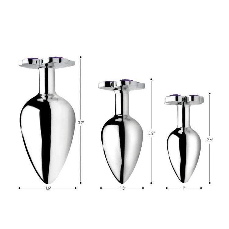 This floral, heart themed anal plug set features three premium tapered (nickel free) alloy plugs in a stunning silver finish, set with flower petal design; multi-cut, heart-shaped, deep purple acrylic gemstones in each base. Sleek and fixed, the perfectly weighted sizing suits users of all skill levels and genders. Enjoy on your own, adding a sense of luxury to you own stimulation, or share with your partner, giving them a special invitation or show with these stunning silver accessories…