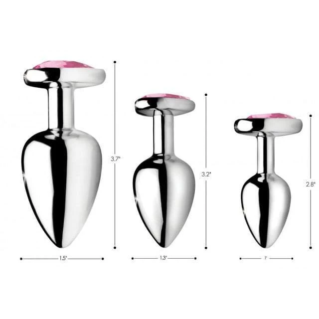 This gorgeous anal plug set features three premium tapered alloy plugs in a stunning brushed silver finish, richly set with stunning (acrylic pink) heart-shaped gemstones on each base. Smooth and solid, the modest weight and sizing suits beginners to advanced, with capacity for wear under everyday clothing as a personal secret, or for show, adding an element like no other to any sensual play/display. Fully water and rust proof, they are definitely an accessory for all seasons and environments!