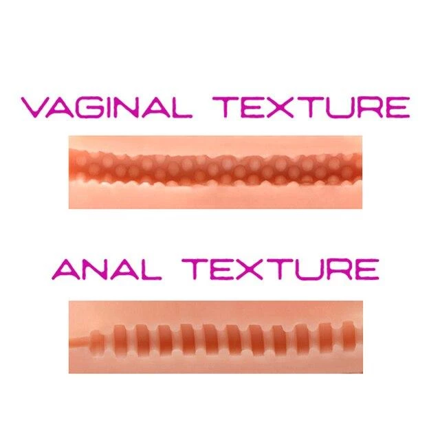 The masturbator is made from body-safe TPR rubber and is compatible with both water and silicone-based lubes. The openings are stretchy and fit all penis sizes. The toy is designed with one flat side, making it ideal for propping the masturbator on the bed, on pillows, or on any convenient surface. There are two internal channels, one for the pussy, and the other for the ass.